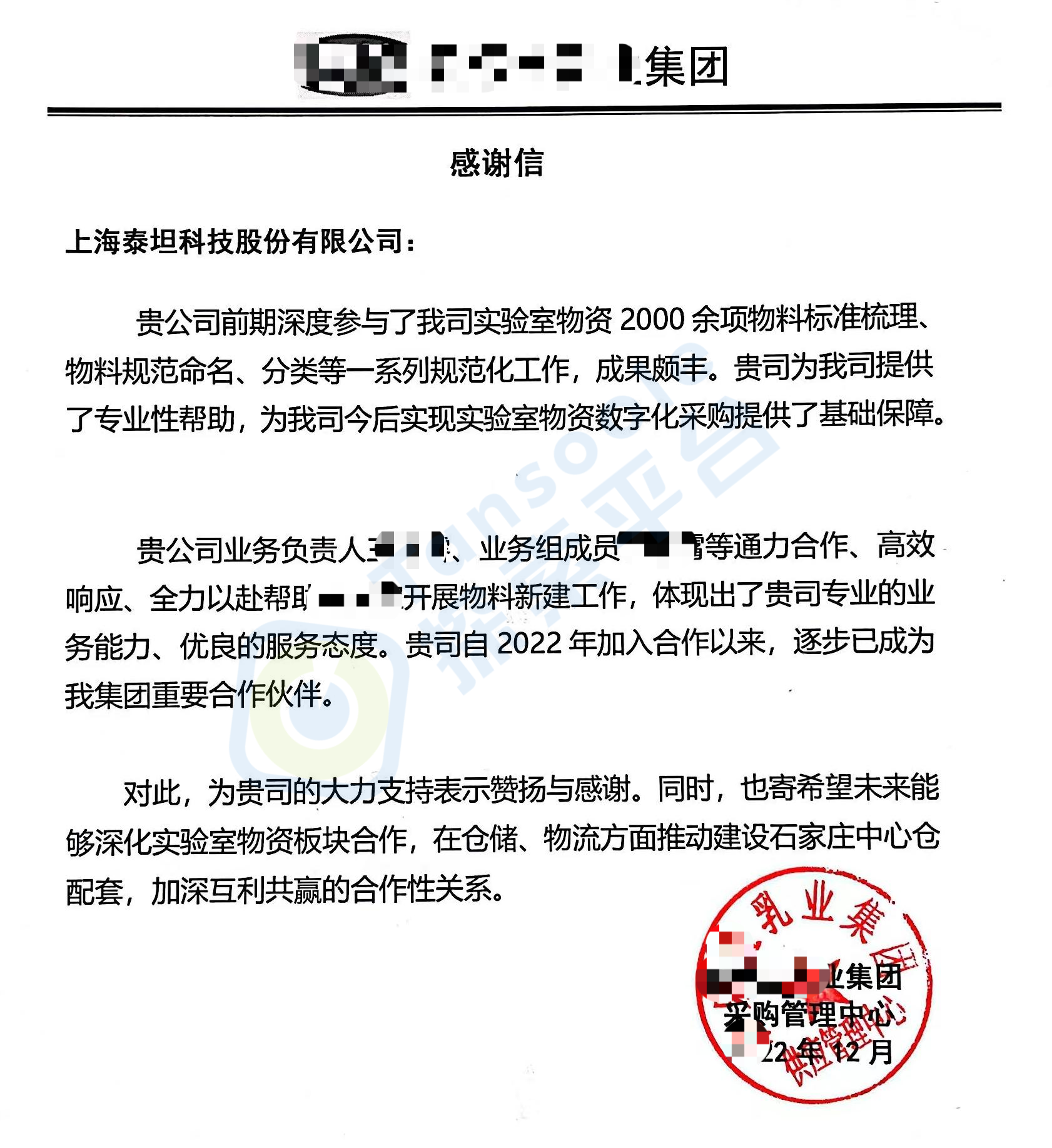 某合作集团发来的感谢信